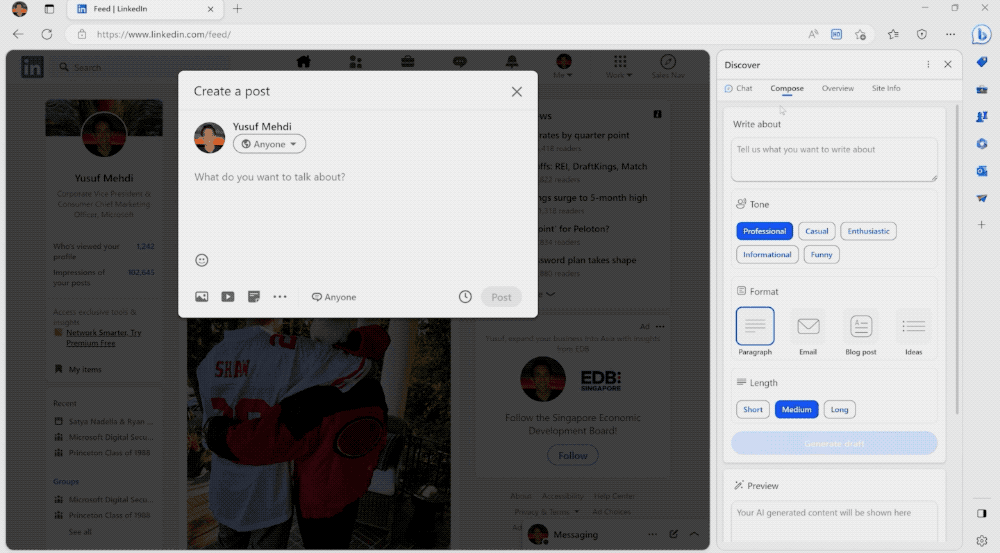 如果你想在LinkedIn(領(lǐng)英網(wǎng))上發(fā)帖子,可以點擊右側(cè)的“Compose”,讓AI按照你的要求幫你寫一份文字草稿,你再做修改優(yōu)化。