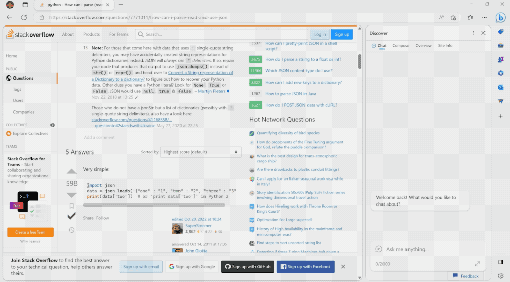 (5)全新Microsoft Edge體驗。微軟更新了Edge瀏覽器,增加了新的AI功能和新外觀,還增加了兩項新功能:聊天和撰寫。借助Edge側(cè)邊欄,你可以讓它從一份冗長的財報中總結(jié)出關(guān)鍵信息,讓Edge幫你撰寫指定要求的內(nèi)容,以及更新帖子的語氣、格式和長度。Edge能理解你所在的網(wǎng)頁,并進行相應的調(diào)整。