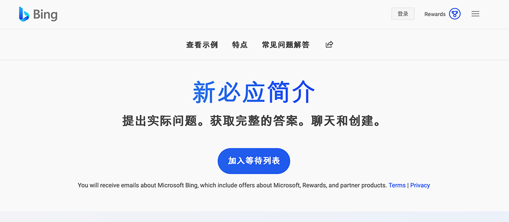 更深度地體驗新功能,則需先登陸賬戶,選擇“加入等待列表”,等微軟審核通過后,你的郵箱就會收到一封電子郵件,表明你可以訪問新版Bing的更多功能。
