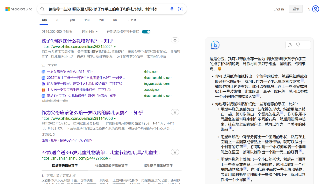 左側(cè)的搜索結(jié)果列出了一系列的網(wǎng)頁搜索結(jié)果,包括「孩子 1 周歲送什么禮物好呢?」「22 款適合送 3-6 歲兒童禮物清單……」「作為父母應(yīng)該怎么陪一歲以內(nèi)的嬰兒玩耍?」等,其中有相關(guān)的,但不完全匹配提問;也有從標(biāo)題看不相關(guān)的,比如問題的前置條件是「1 周歲至 3 周歲」,卻出現(xiàn)了「一歲以內(nèi)」的搜索結(jié)果。