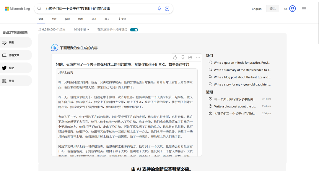 除此之外,新必應(yīng)還支持文本生成功能,示范用例中就包括寫詩、寫睡前故事,比如輸入「為孩子們寫一個(gè)關(guān)于住在月球上的狗的故事」,就能生成對應(yīng)的故事并置頂在搜索結(jié)果前。