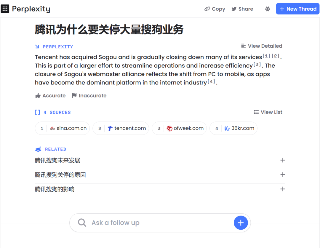 此外,Perplexity 一般會(huì)給出一個(gè)相對簡要的回答,用戶可以選擇查看 AI 更為詳細(xì)的回答。同時(shí) Perplexity 也強(qiáng)調(diào)「追問」,用戶基于之前的提問和回答繼續(xù)提出相關(guān)或延伸的問題。換言之,Perplexity 其實(shí)更多是在 ChatGPT 使用體驗(yàn)上針對搜索場景進(jìn)行改良,包括信息來源的標(biāo)注和相關(guān)推薦。