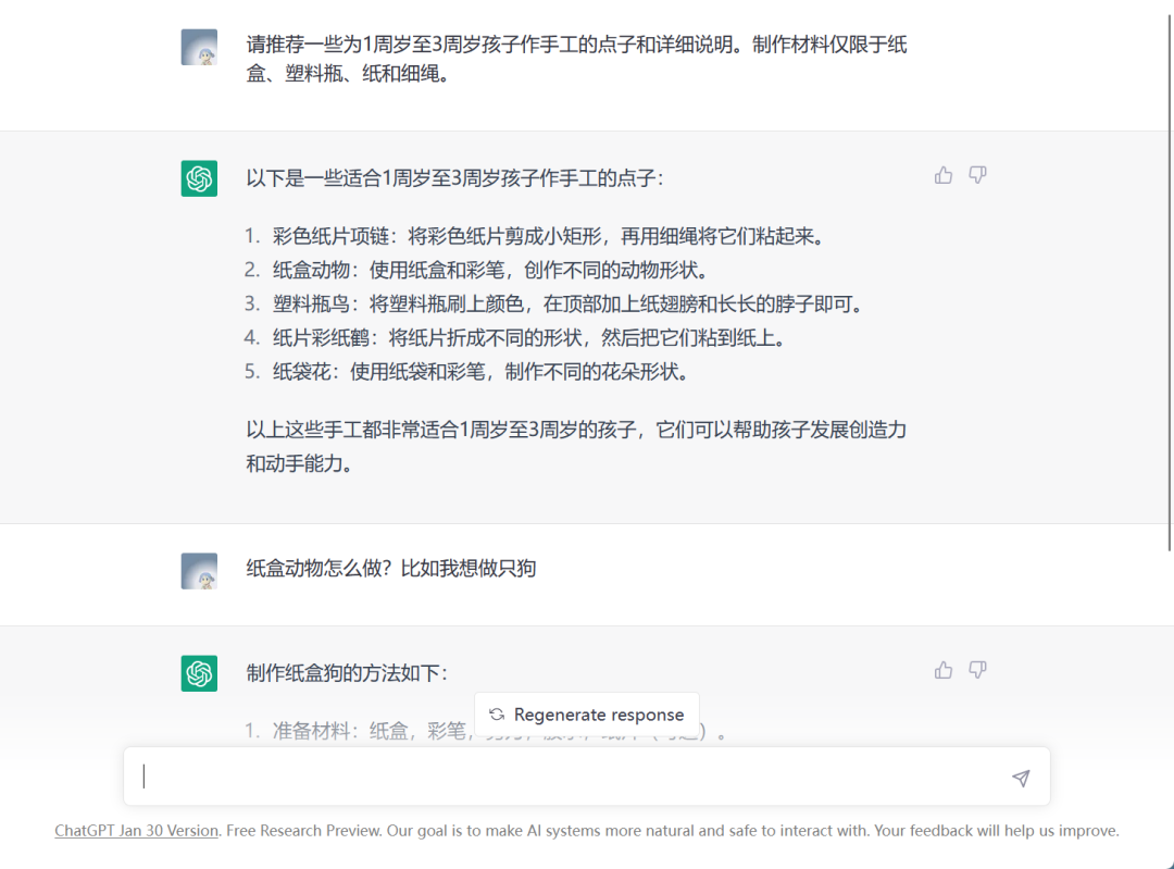 其中一個(gè)用例是:「請推薦一些為 1 周歲至 3 周歲孩子作手工的點(diǎn)子和詳細(xì)說明。制作材料僅限于紙盒、塑料瓶、紙和細(xì)繩?!?/p>