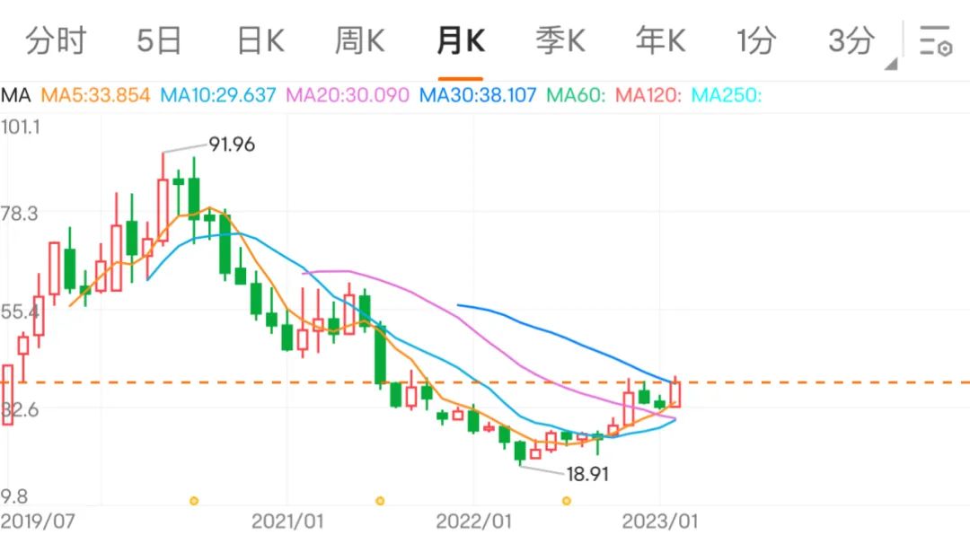 過去的兩年,丸美股價一路走低,從91.96元/股的最高點跌至2023年2月9日的38.43元/股,股價已經(jīng)跌去近6成。