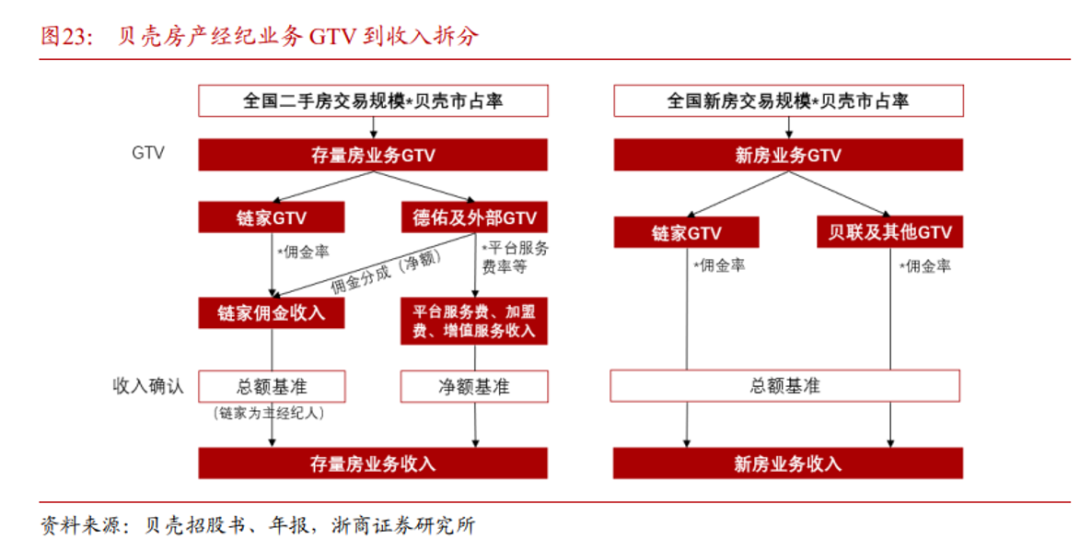 其次是,貝殼找房的支柱業(yè)務(wù)的優(yōu)勢是否穩(wěn)固。中國房地產(chǎn)交易市場一直以來都呈現(xiàn)高度分散、規(guī)則不清晰的狀態(tài)。貝殼找房最大的依據(jù)是GTV,它最早在招股書中披露了GTV。2019年,貝殼找房的GTV為2.13萬億元,同期中國住房市場的規(guī)模為22.3 萬億元,這意味著它的市場份額接近10%。