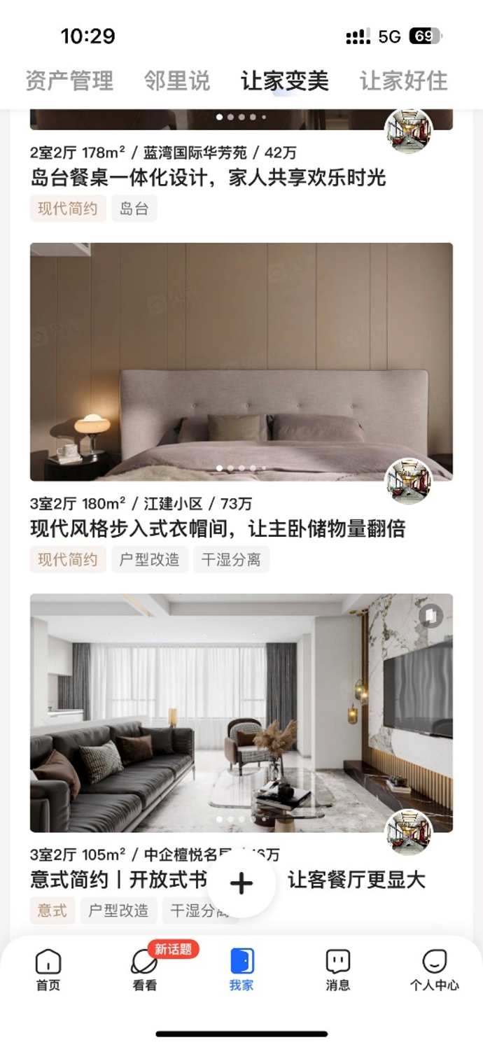 今年1月中旬,貝殼App全新升級改版,新的首頁底部導(dǎo)航欄增加了“我家”頻道,里面集合了房產(chǎn)買賣租賃和家裝家居等功能。在上線“我家”的城市,用戶可預(yù)約維修等家庭服務(wù)、做專屬戶型分析并獲取裝修方案等服務(wù)。