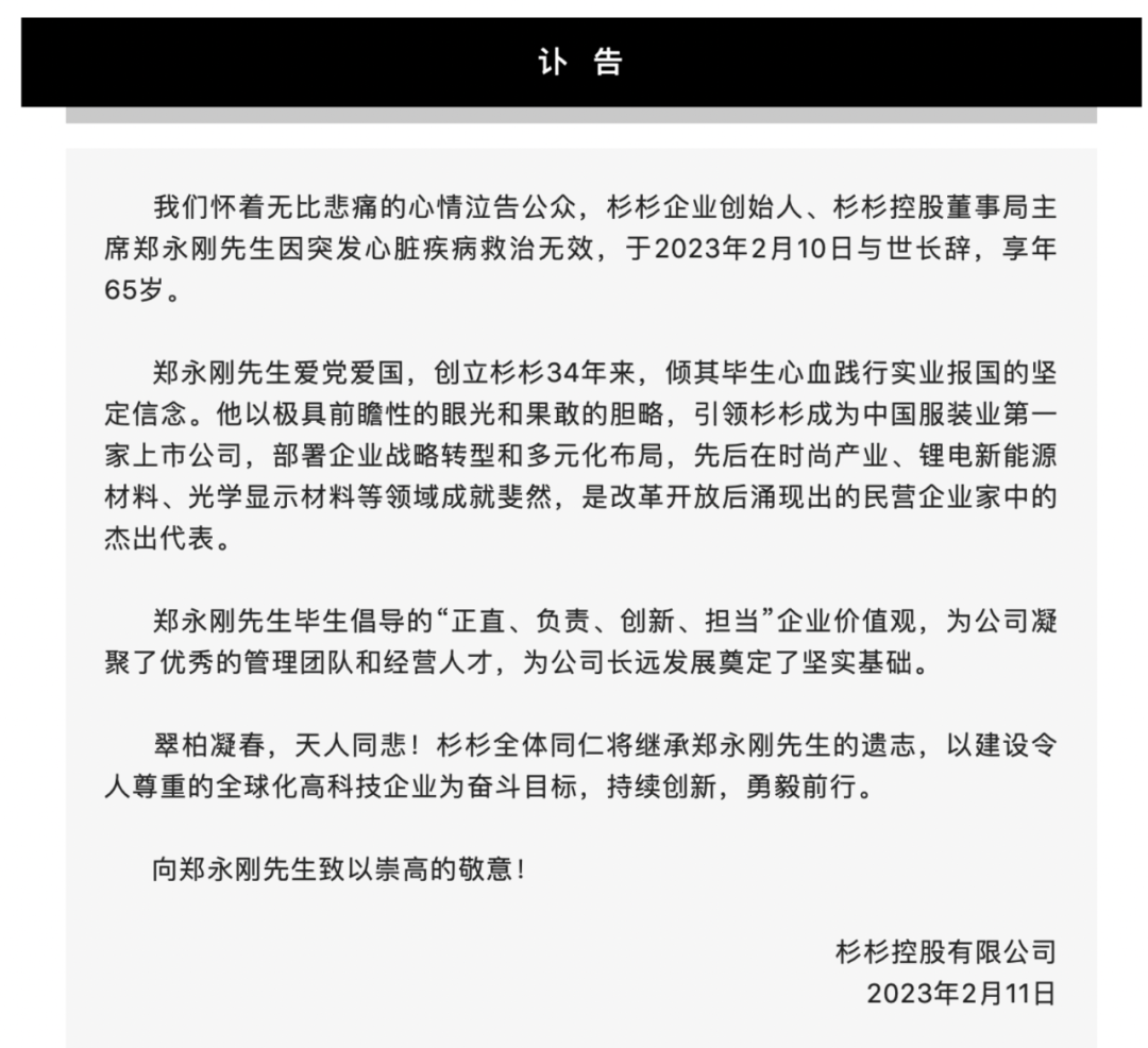 一代風(fēng)云浙商落幕。2月11日,杉杉控股有限公司官方網(wǎng)站發(fā)布訃告,杉杉企業(yè)創(chuàng)始人、杉杉控股董事局主席鄭永剛在2月10日因突發(fā)心臟疾病去世,享年65歲。杉杉官網(wǎng)也在當(dāng)日變成黑白顏色以示悼念。