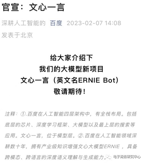 2月7日,百度對外宣布其類ChatGPT應(yīng)用命名為文心一言,將在3月份完成內(nèi)測并對外開放。此前,彭博社曾爆料百度這款類ChatGPT應(yīng)用將圍繞語言模型、語義理解框架等環(huán)節(jié)進(jìn)行提升,最終上線的版本會(huì)全面嵌入百度搜索系統(tǒng),并提供寫小說、詩歌、對聯(lián)等功能。