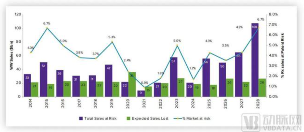 全球銷售面臨專利到期風(fēng)險的藥物市場規(guī)模,數(shù)據(jù)源于Evaluate Pharma