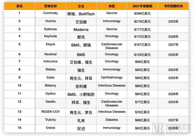 2021年全球銷售排名前列藥品專利期,數(shù)據(jù)源于Njarearson研究小組及公開信息收集整理
