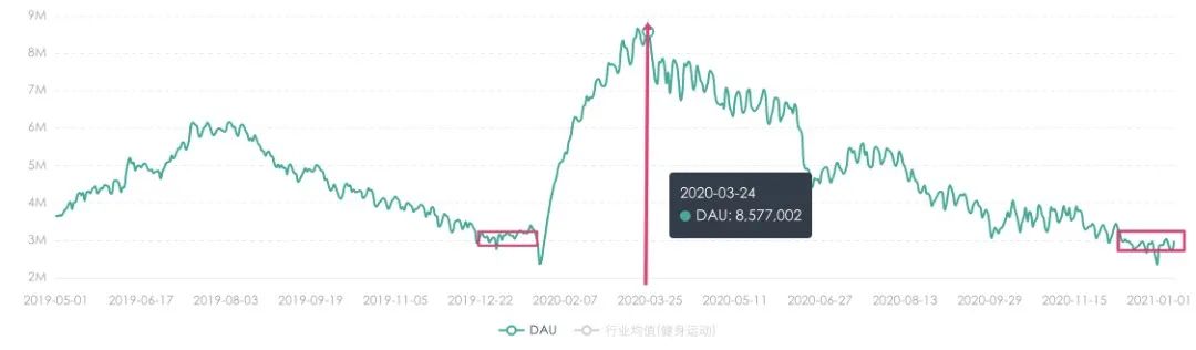 另一邊,Keep自己的數(shù)據(jù)也表明,平臺粘住用戶的能力還有所欠缺。2020年3月,也是疫情比較嚴峻的時候,Keep曾有高達850萬的活躍用戶。時隔數(shù)月后發(fā)現(xiàn),暴漲的那群人并沒有很好的被留存住。秋冬之后,Keep的DAU(日活躍用戶)又跌回了前一年同期(2019年底-2020年初)300萬左右DAU的水平。