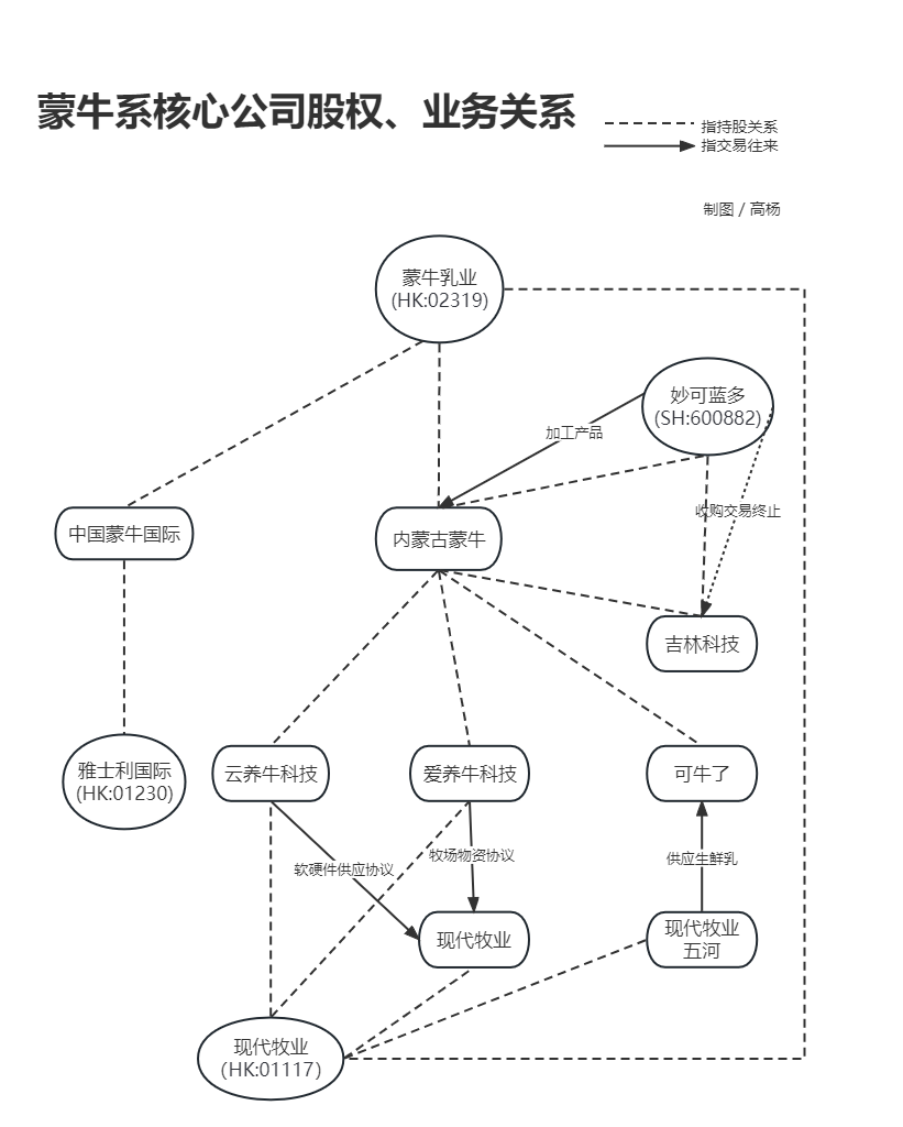 此外,現(xiàn)代牧業(yè)也與蒙牛乳業(yè)持股的多家公司,頻頻交易包括可牛了、愛(ài)養(yǎng)牛和云養(yǎng)牛。
