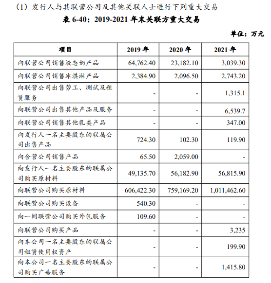 募集說(shuō)明書(shū)顯示,蒙牛乳業(yè)所披露與關(guān)聯(lián)方的重大交易中,涉及金額較大的主要為購(gòu)買(mǎi)原材料及銷(xiāo)售液態(tài)奶產(chǎn)品事項(xiàng)。2019年、2020年、2021年,蒙牛乳業(yè)向聯(lián)營(yíng)公司購(gòu)買(mǎi)原材料的金額分別為60.64億元、75.92億元、101.15億元,向聯(lián)營(yíng)公司銷(xiāo)售液態(tài)奶產(chǎn)品的金額分別為6.48億元、2.32億元、3039.3萬(wàn)元。