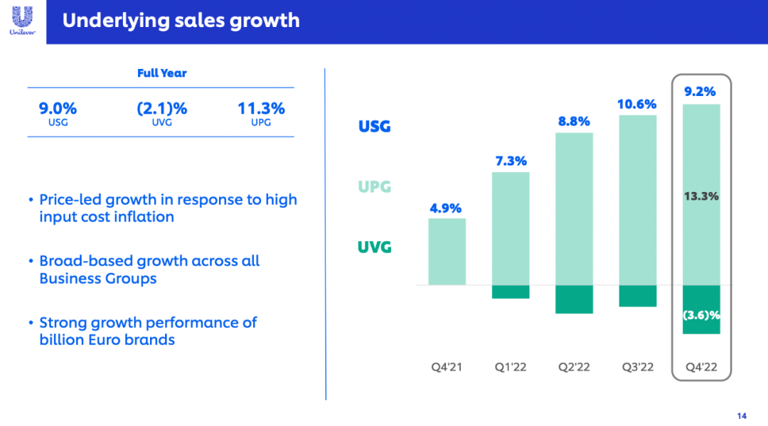 其表示,在2022年第四季度,聯(lián)合利華基本銷售額增長(zhǎng)9.2%,由13.3%的價(jià)格增長(zhǎng)推動(dòng),銷量下降3.6%。這也導(dǎo)致聯(lián)合利華全年基本銷售額增長(zhǎng)9%,價(jià)格增長(zhǎng)11.3%,銷量下降2.1%。