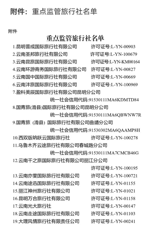 近日,云南省文化和旅游廳發(fā)布通知,決定將全省2023年1月投訴量排名靠前的19家旅行社列入全省重點(diǎn)監(jiān)管名單,這些旅行社的注冊(cè)地址包括了昆明、大理、麗江、西雙版納等熱門旅游目的地。同時(shí)請(qǐng)屬地文化和旅游部門對(duì)重點(diǎn)監(jiān)管名單所列旅行社進(jìn)行約談?wù)?,列入州市紅黑榜的“黑榜”。