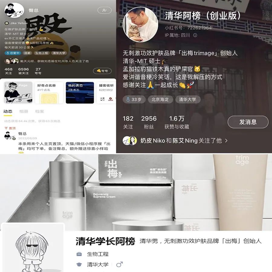 無刺激功效護(hù)膚品牌trimage出梅的創(chuàng)始人 @清華阿榜(創(chuàng)業(yè)版)原是外匯交易員,以“清華男不搞金融搞護(hù)膚品”的人設(shè),在知乎、小紅書和即刻等臺(tái),都把“出梅創(chuàng)始人”的標(biāo)簽寫在簡介中。