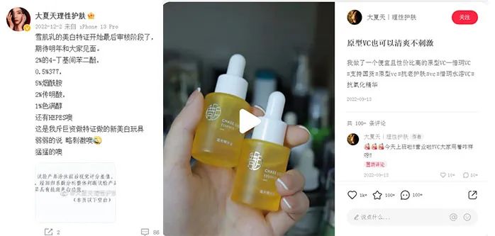 以15%濃度醇溶原型VC出圈的惜玥同樣出自專業(yè)配方師之手。該品牌創(chuàng)始人@大夏天理性護(hù)膚 本身也是一個(gè)護(hù)膚KOL,在多平臺(tái)更新新品研發(fā)動(dòng)態(tài)、美妝行業(yè)真相、年度愛用、行業(yè)活動(dòng)、消費(fèi)者偏好調(diào)研等行業(yè)內(nèi)容,不斷強(qiáng)化專業(yè)背景,更讓人信服,加深品牌好感度。