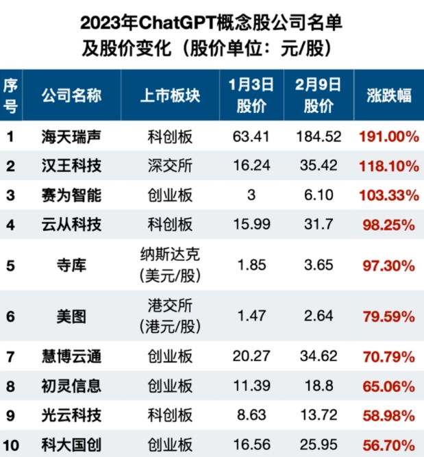 國內(nèi)ChatGPT概念股前十企業(yè)1月3日-2月9日漲幅
