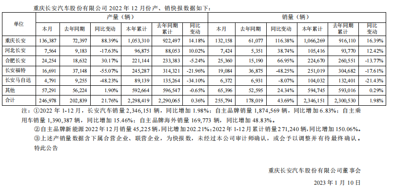 長(zhǎng)安汽車2023年定下了銷售280萬輛的目標(biāo),在去年銷量基礎(chǔ)上增長(zhǎng)19.65%。但根據(jù)最新公布的產(chǎn)銷售數(shù)據(jù),1月公司汽車銷量為171805輛,同比減少38.03%;對(duì)比去年12月數(shù)據(jù),環(huán)比下降32.83%。