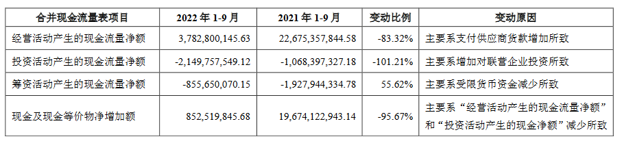 2022年現(xiàn)金流情況依舊嚴(yán)峻。前三季度公司經(jīng)營(yíng)活動(dòng)現(xiàn)金流凈額為37.83億元,同比下降83.32%;籌資活動(dòng)現(xiàn)金流凈額-8.56億元,同比上漲55.62%;投資活動(dòng)現(xiàn)金流凈額-21.50億元,同比下降95.67%;現(xiàn)金及現(xiàn)金等價(jià)物凈增加額為8.53億元,同比下降95.67%。
