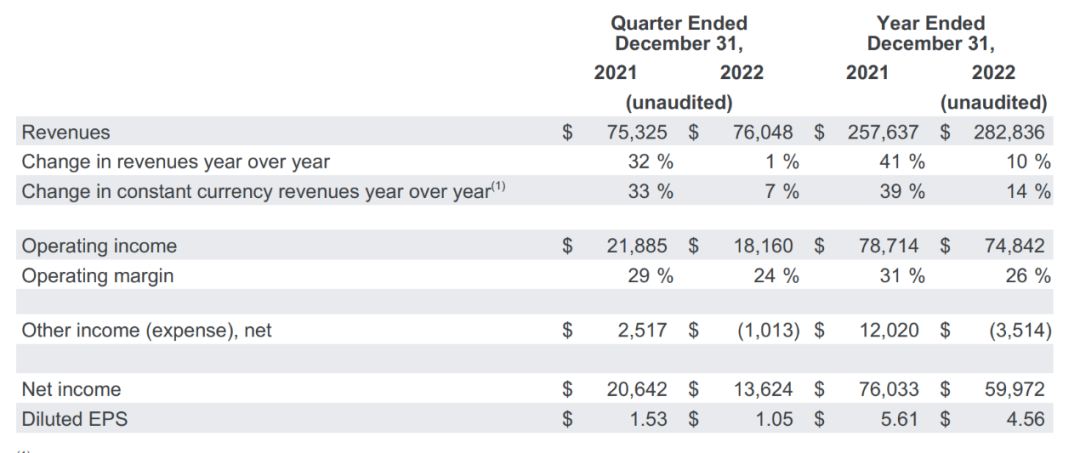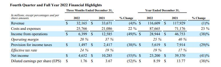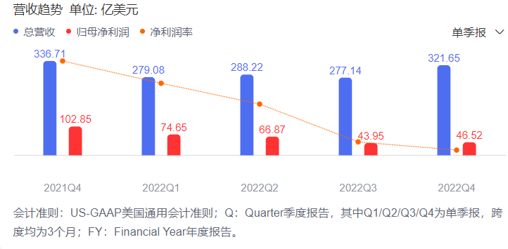 同時,該公司還披露了2022年度業(yè)績,期內(nèi)實現(xiàn)營收2828.36億美元,同比增長10%;實現(xiàn)凈利潤599.72億美元,同比下降21%;實現(xiàn)每股攤薄收益4.56億美元,低于去年同期的5.61億美元。