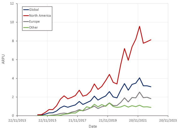 最終的結果也能極為直觀的看到:Snapchat的ARPU值已經(jīng)連續(xù)三季度同比下滑,數(shù)據(jù)顯示,2022年第四季度,Snap的ARPU值為3.47美元,相比上年同期的4.06美元,下滑15%。