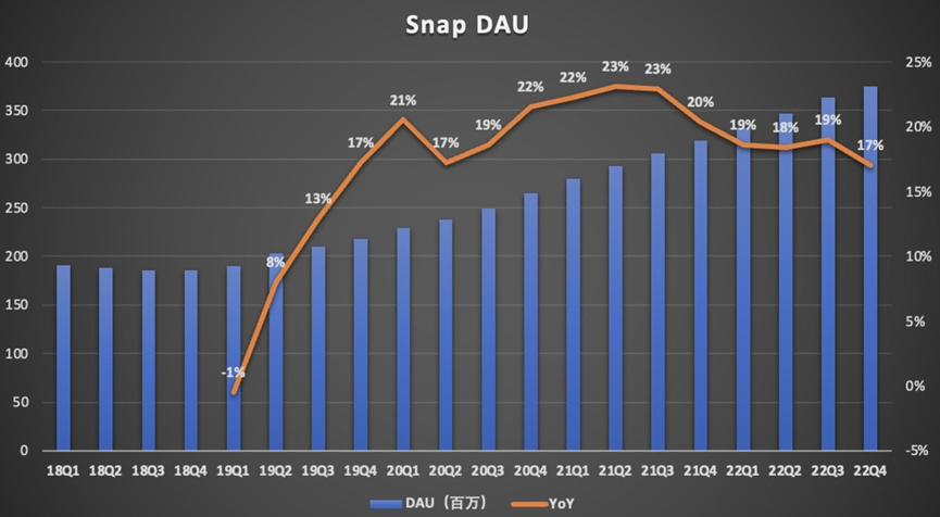于是作為社交平臺的重要衡量指標,Snapchat每日活躍用戶同比增速也在放緩。財報顯示,Snapchat第四季度日活用戶(DAU)為3.75億,同比增長17%,低于上一季度19%的同比增速,以及上年同期20%的同比增速。
