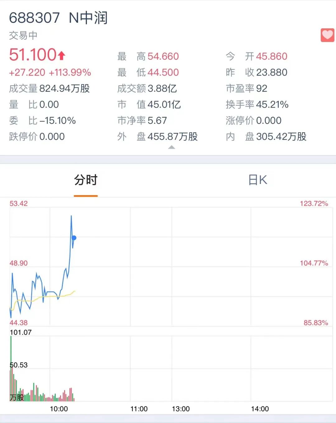 2月16日,嘉興中潤光學(xué)科技股份有限公司(簡稱中潤光學(xué))登陸科創(chuàng)板,發(fā)行價為23.88元/股,開盤價為45.86元/股,較發(fā)行價上漲92%。截至10:17分,中潤光學(xué)股價為51.1元/股,較發(fā)行價上漲114%,市值達45億元。