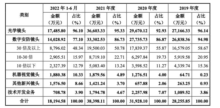 其中,光學(xué)鏡頭產(chǎn)品銷售收入及技術(shù)開發(fā)業(yè)務(wù)收入為公司主營業(yè)務(wù),根據(jù)應(yīng)用領(lǐng)域可劃分為數(shù)字安防、機器視覺及其他,其收入在報告期內(nèi)分別為2.72億元、2.97億元,3.66億元和1.75億元,占營業(yè)收入的比例分別為 99.42%、95.50%、 96.84%及 96.90%。