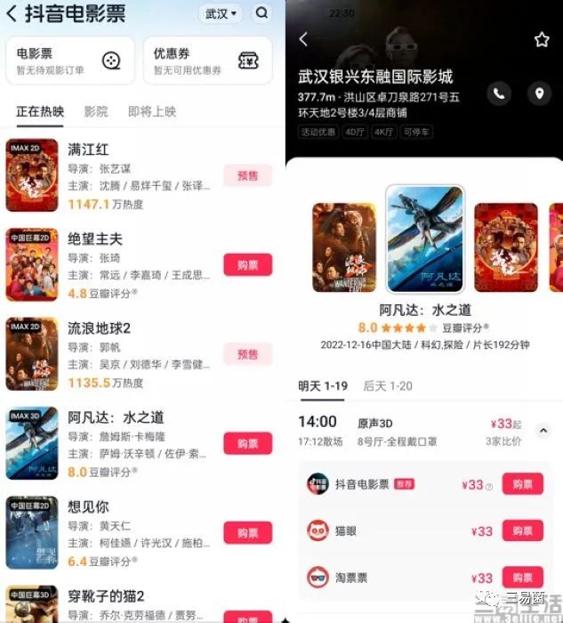 例如在2022年6月,抖音在APP頂部推出“探索”頻道,內(nèi)容則為以種草類圖文和視頻為主的雙列信息流,與小紅書極為相似;并將貨架式電商的“商城”提升到APP的一級入口處,頁面布局更是與淘寶、京東、拼多多幾無二致。隨后在同年10月,還推出了票務平臺“抖音電影票”,使得用戶無需跳轉第三方小程序或APP,在站內(nèi)搜索關鍵詞即可購票。