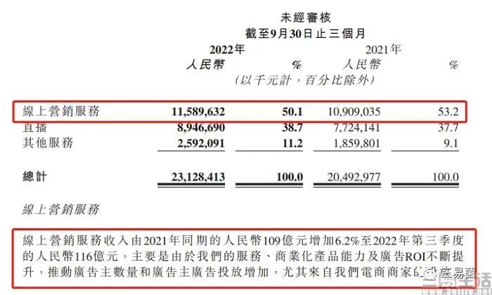 其中以電商為例,據(jù)《晚點LatePost》此前的相關報道顯示,2022年第一季度抖音有超過1/3 的廣告收入來自這個業(yè)務。其實這一點在快手身上也得到了驗證,在2022年第三季度的財報中該公司就曾明確表示,來自平臺商家的投放是其廣告收入實現(xiàn)同比增長6.2%的重要因素。