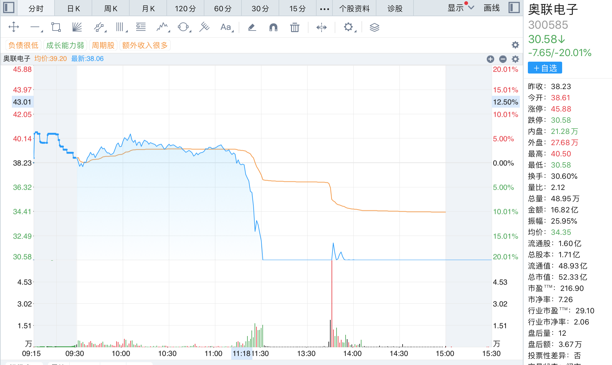 2月21日,滬深兩指風和日麗之下,奧聯(lián)電子的天空突降暴雨。上午11點19分左右,奧聯(lián)電子一改前面一個來小時的波瀾不驚,呈現(xiàn)崩潰之相。大量的拋單令奧聯(lián)電子的股價,在午間收盤前快速向跌停板砸去。局勢在下午并未有大的改觀,最終奧聯(lián)電子以20.01%的跌幅收盤,換手率30.6%,股價報收于30.58元,市值蒸發(fā)13億以上。