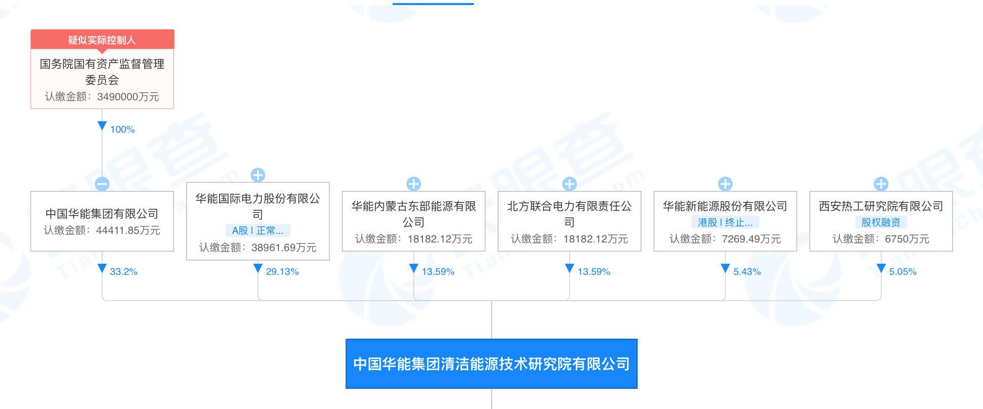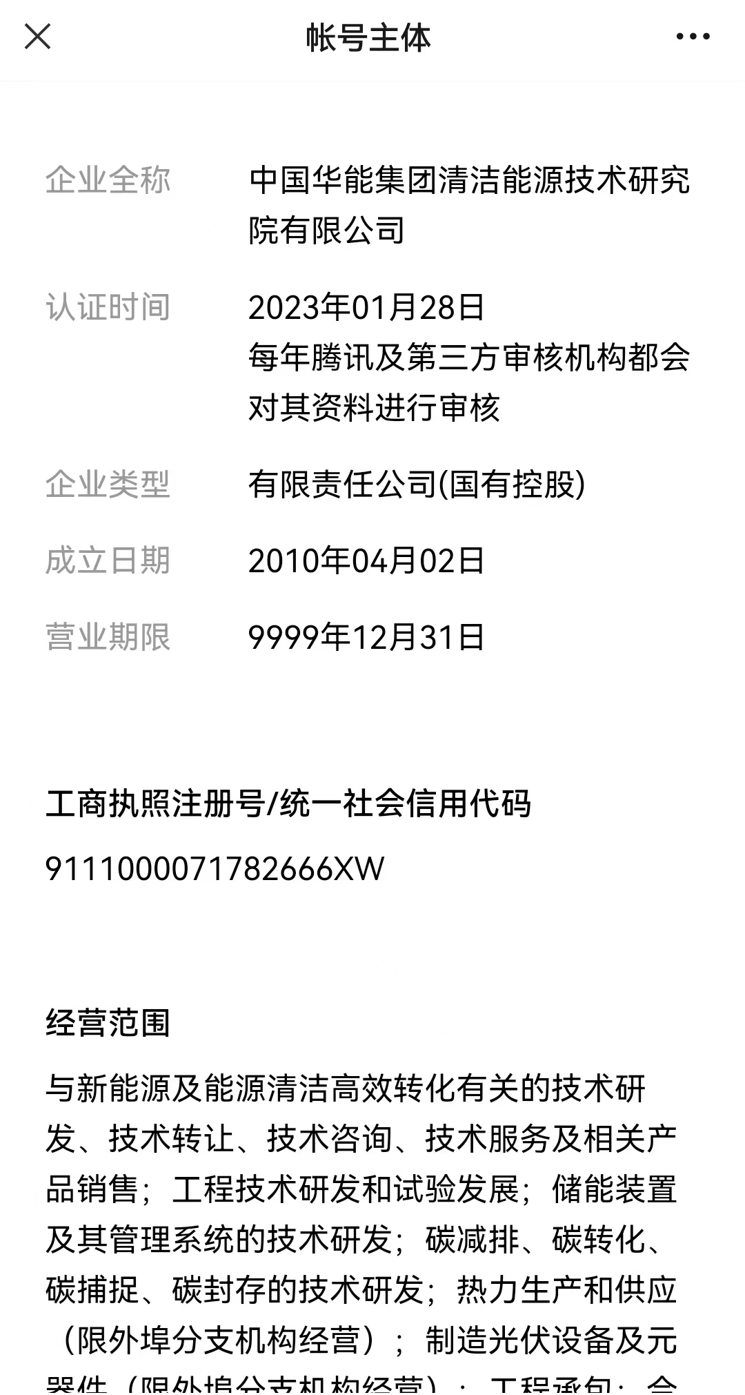 根據(jù)公開內(nèi)容,“華能清潔能源研究所”賬號的主體為中國華能集團清潔能源技術(shù)研究院有限公司。根據(jù)天眼查信息,研究院由中國華能集團有限公司持股33.2%,華電國際持股29.13%。中國華能集團有限公司由國資委100%控制。