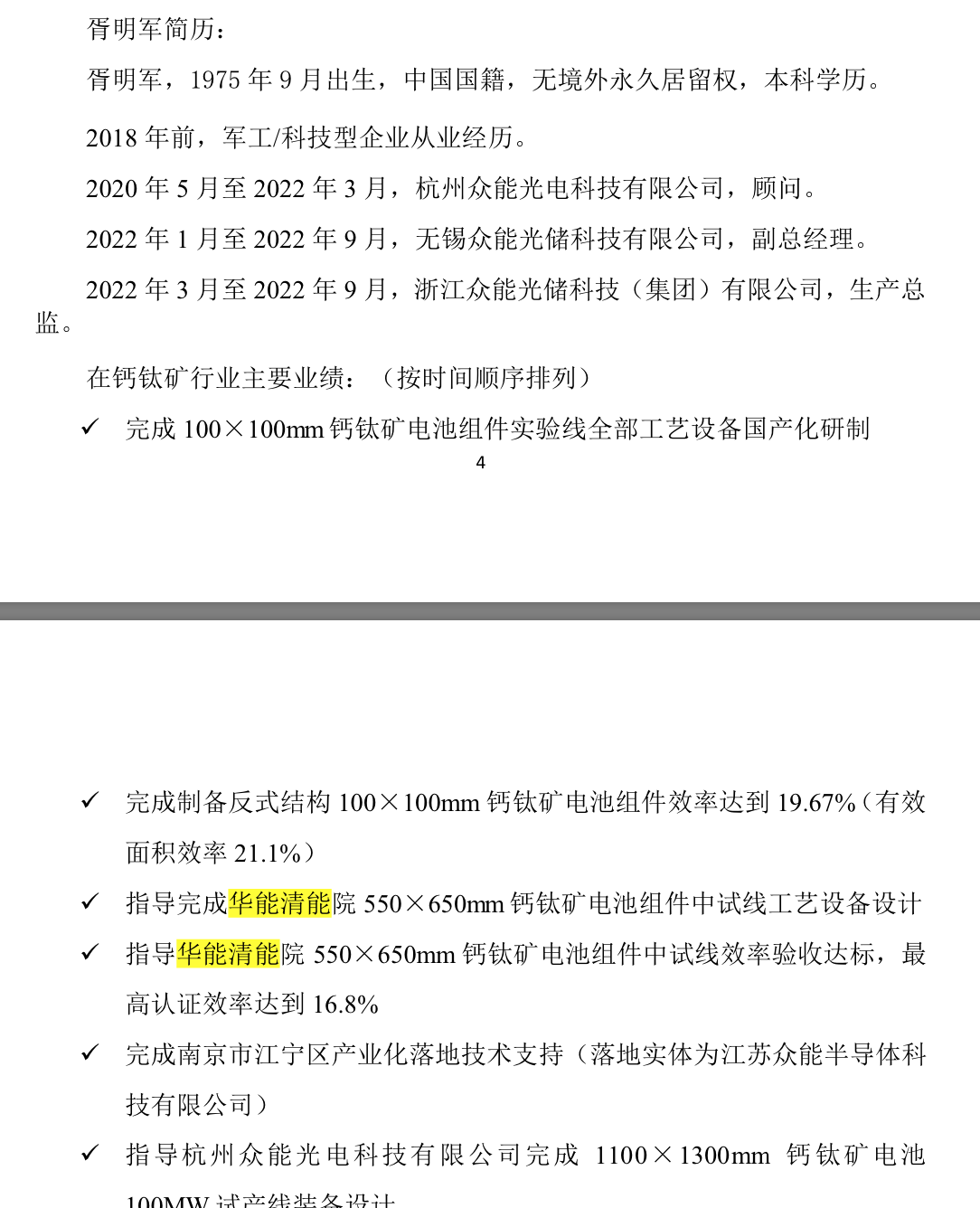 根據(jù)監(jiān)管層的要求,奧聯(lián)電子在公告中披露了胥明軍的簡歷,其中有提及“指導完成華能清能院550×650mm鈣鈦礦電池組件中試線工藝設(shè)備設(shè)計”,以及“指導華能清能院550×650mm鈣鈦礦電池組件中試線效率驗收達標,最高認證效率達到16.8%”。這一描述顯然令中國華能集團清潔能源技術(shù)研究院有限公司不快,并才有了上述的聲明。