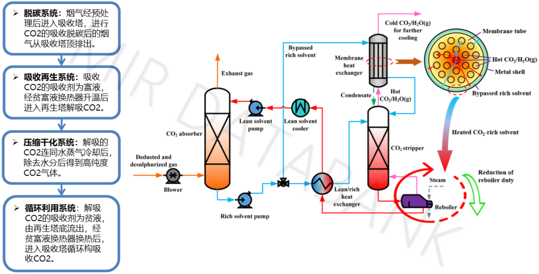 我們以燃燒后捕捉化學(xué)吸收法為例,其碳捕捉要經(jīng)過脫碳-吸收再生-壓縮干化-循環(huán)利用等環(huán)節(jié),涉及到煙氣吸收塔、換熱器等設(shè)備。