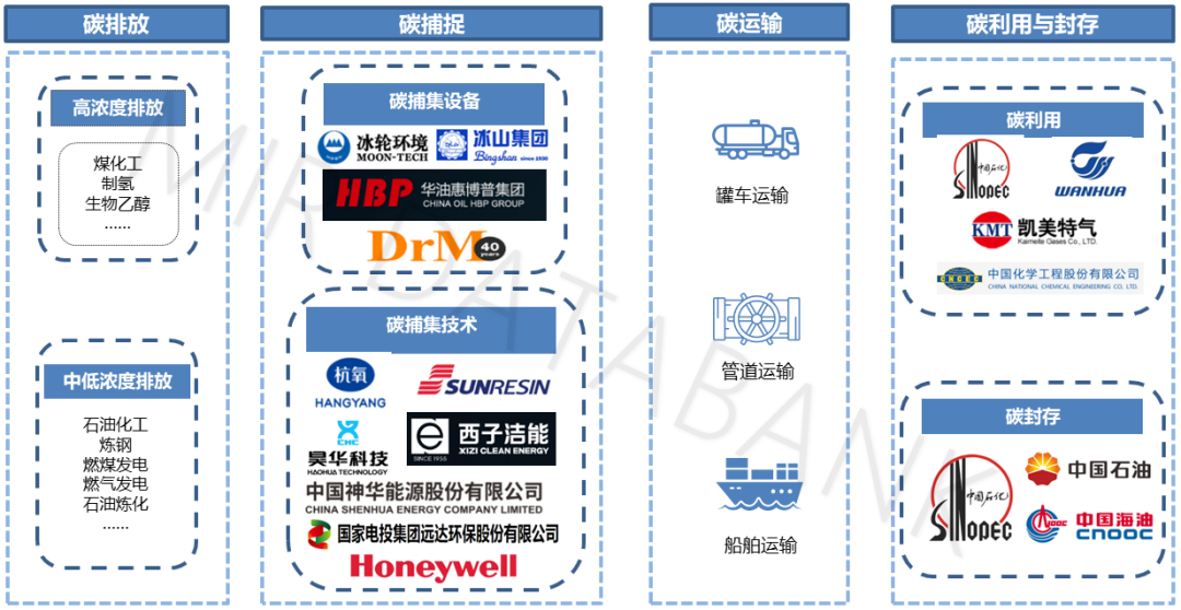 當(dāng)然碳捕集不是獨立存在的技術(shù),在實際生產(chǎn)中,它經(jīng)常與碳運輸、碳利用與封存一起稱為CCUS。當(dāng)下中國的CCUS生態(tài)如下所示: