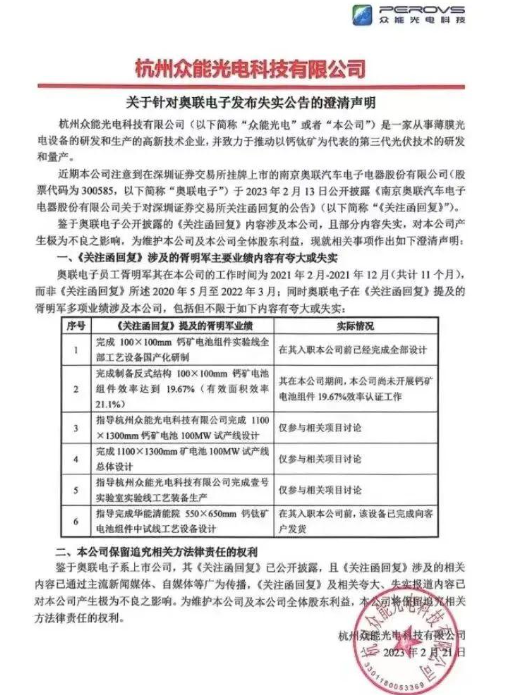 2月22日,胥明軍早前曾任職的眾能光電發(fā)布澄清聲明,表示奧聯(lián)電子此前公告中涉及的胥明軍主要業(yè)績內(nèi)容有夸大或失實,公司保留追究相關(guān)方法律責(zé)任的權(quán)利。