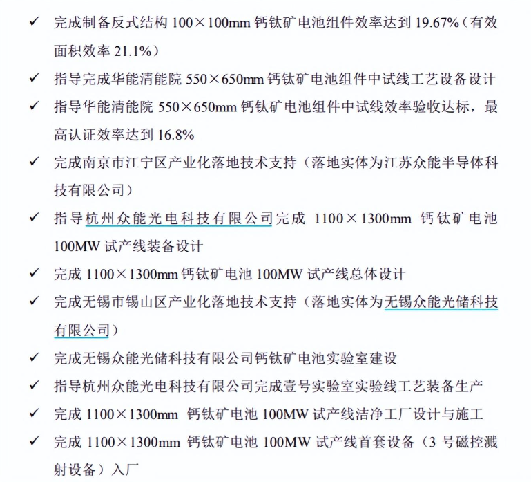 其中,奧聯(lián)電子在回復(fù)函中提到的“完成100X100mm鈣礦電池組件實驗線全部工藝設(shè)備國產(chǎn)化研制”,眾能光電表示,在胥明軍入職公司前已經(jīng)完成全部設(shè)計。奧聯(lián)電子提到的另一項“完成制備反式結(jié)構(gòu)100X100mm鈣礦電池組件效率達(dá)到19.67%(有效面積效率21.1%)”業(yè)績,眾能光電則表示,胥明軍在公司期間,公司尚未開展鈣礦電池組件19.67%效率認(rèn)證工作。