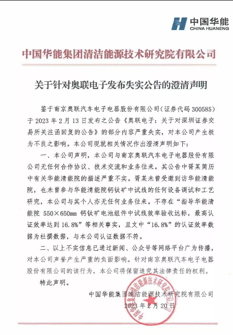 在此之前,奧聯(lián)電子公開表述過的胥明軍曾任職公司華能清能院,已經(jīng)發(fā)聲明撇清關(guān)系。華能清能院表示,公司與奧聯(lián)電子無任何合作協(xié)議、技術(shù)交流和業(yè)務(wù)往來,且奧聯(lián)電子公告中提到的胥明軍簡歷中有關(guān)華能清能院的描述嚴(yán)重不實。