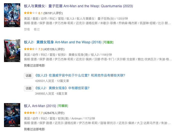豆瓣評分6.1分,遠低于前兩部的7.7分和7.3分;上映6天后票房僅1.6億,機構預測票房從早期的6-7億下降到了3億以下,前兩部《蟻人》分別在內(nèi)地市場拿下了6.7億、8.3億票房。與此同時,這部《蟻人3》還是同系列成本最高的一部。