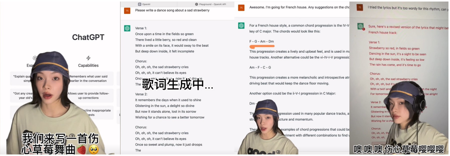 在音樂(lè)圈,也已經(jīng)有音樂(lè)人基于ChatGPT進(jìn)行了實(shí)實(shí)在在的歌曲創(chuàng)作實(shí)踐。劉柏辛用ChatGPT寫(xiě)了一首名為《傷心草莓》的歌曲。其過(guò)程是:音樂(lè)人輸入指令,ChatGPT根據(jù)指令生成歌詞,并提出了對(duì)于曲創(chuàng)作的建議。