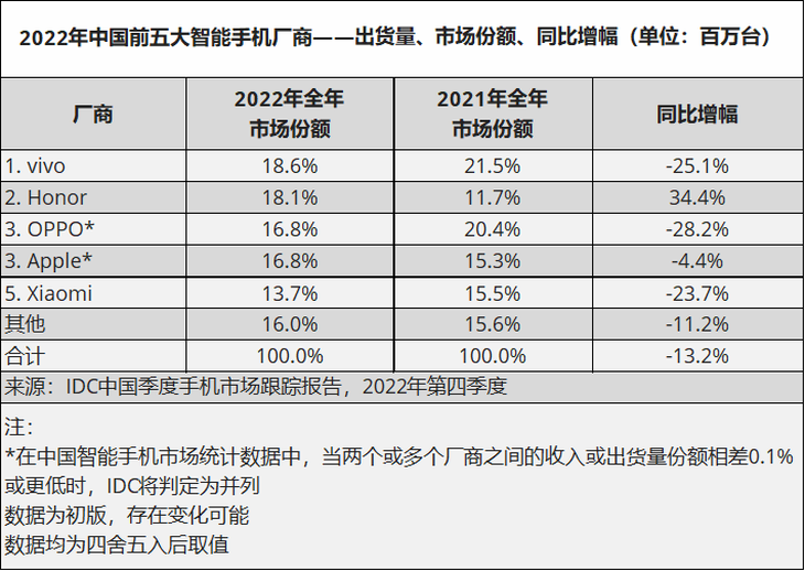 根據(jù)IDC公布的2022年中國智能手機(jī)廠商市場份額數(shù)據(jù)來看,vivo(18.6%)、榮耀(18.1%)、OPPO(16.8%)占據(jù)三甲位置,而蘋果(16.8%)和小米(13.7%)則分列第四和第五名。
