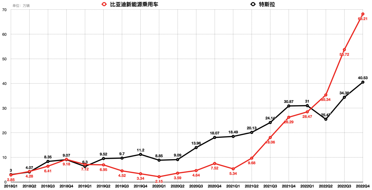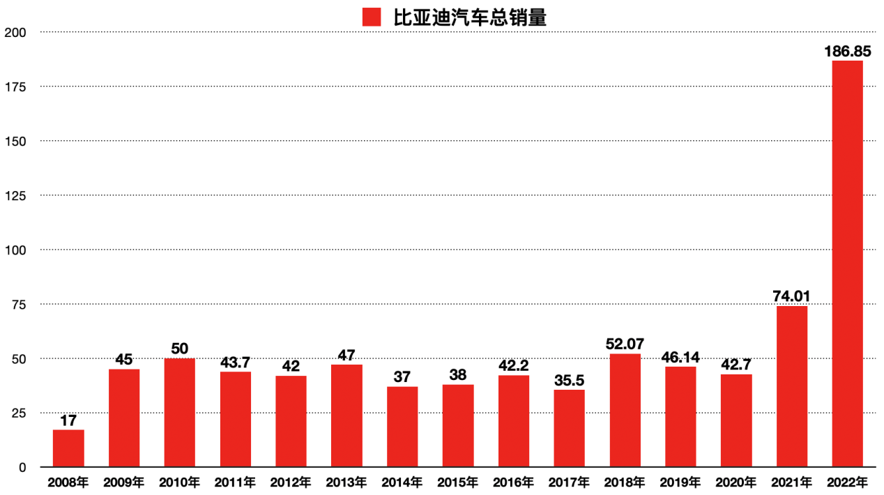時移世易。2022年,比亞迪新能源汽車總銷量186.35萬輛,同比增長208.6%,超越特斯拉躋身全球新能源汽車“銷冠”。