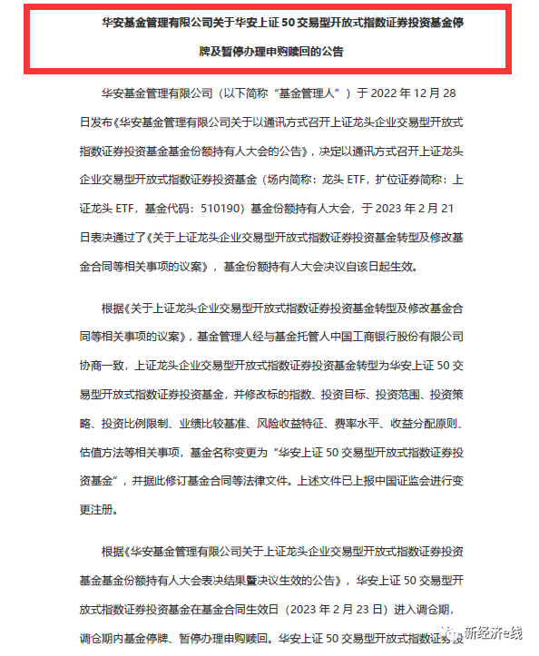 另據(jù)2月23日發(fā)布的華安上證50交易型開放式指數(shù)證券投資基金停牌及暫停辦理申購贖回的公告稱,華安上證50ETF在基金合同生效日(2023年2月23日)進入調(diào)倉期,調(diào)倉期內(nèi)基金停牌、暫停辦理申購贖回。自基金合同生效之日起不超過3個月復(fù)牌并開始辦理申購贖回。
