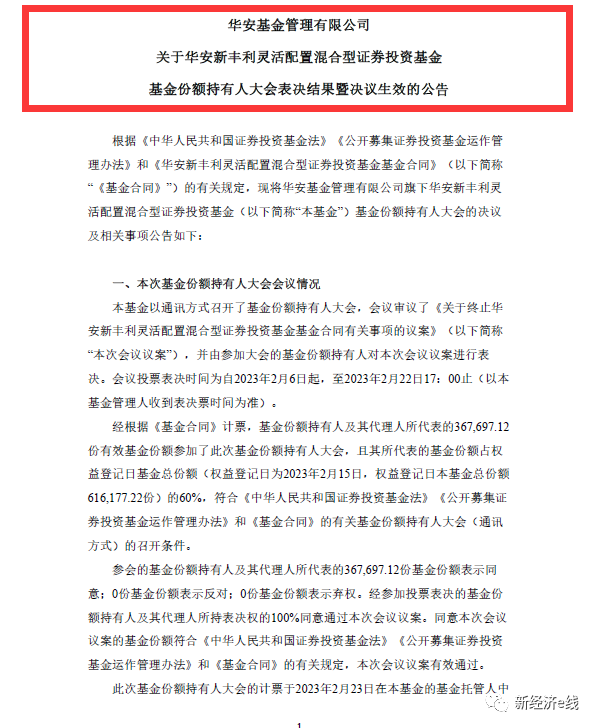 2月24日,華安基金發(fā)布關(guān)于華安新豐利靈活配置混合型證券投資基金基金份額持有人大會表決結(jié)果暨決議生效的公告稱,基金以通訊方式召開了基金份額持有人大會,會議審議了《關(guān)于終止華安新豐利靈活配置混合型證券投資基金基金合同有關(guān)事項的議案》(以下簡稱“本次會議議案”),并由參加大會的基金份額持有人對本次會議議案進行表決。會議投票表決時間為自2023年2月6日起,至2023年2月22日17:00止(以本基金管理人收到表決票時間為準(zhǔn))。