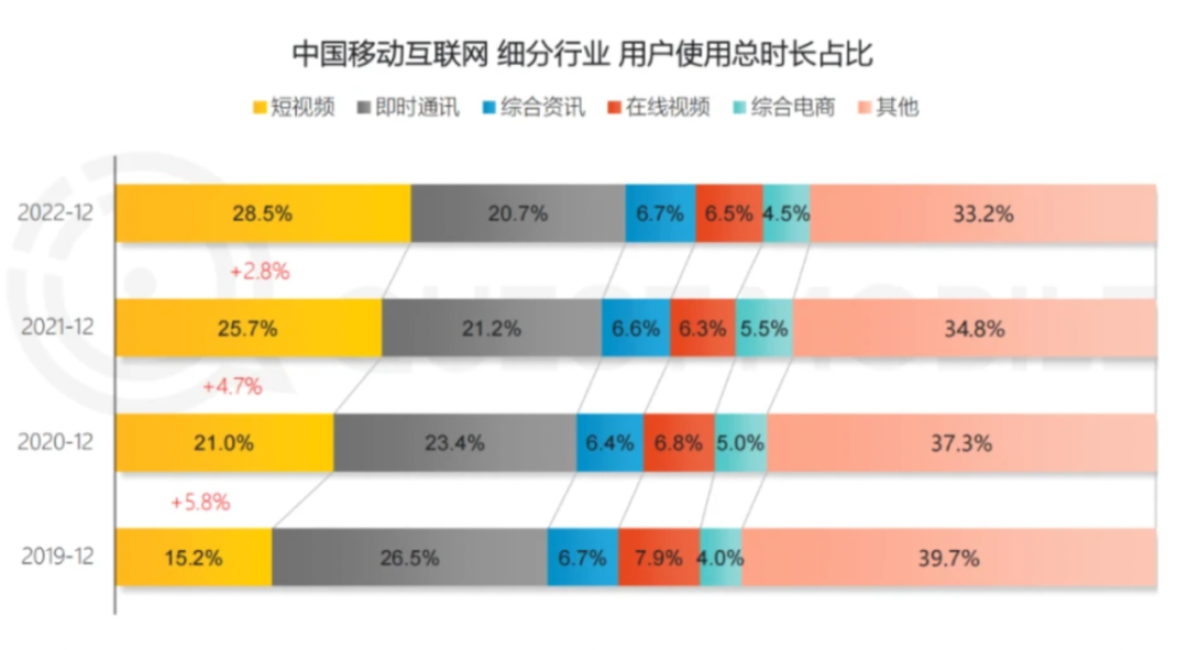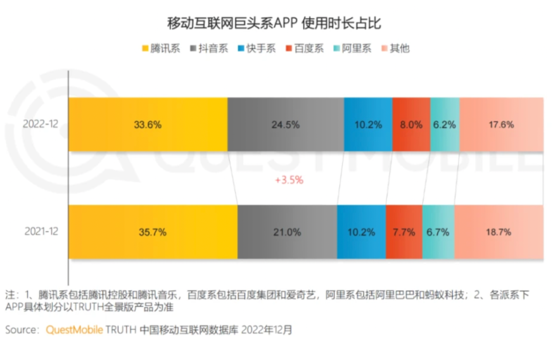 近日,QuestMobile發(fā)布《2022中國移動互聯(lián)網(wǎng)年度報告》,其中最受關(guān)注的莫過于各個平臺之間用戶時長的此消彼長。報告顯示,短視頻已經(jīng)成為用戶時長占比最高的應(yīng)用,由25.7%提升至28.5%,即時通訊則進一步由21.2%下滑至20.7%。騰訊系的用戶時長占比由35.7%減少至33.6%,而抖音系的占比則從21.0%增長至24.5%。