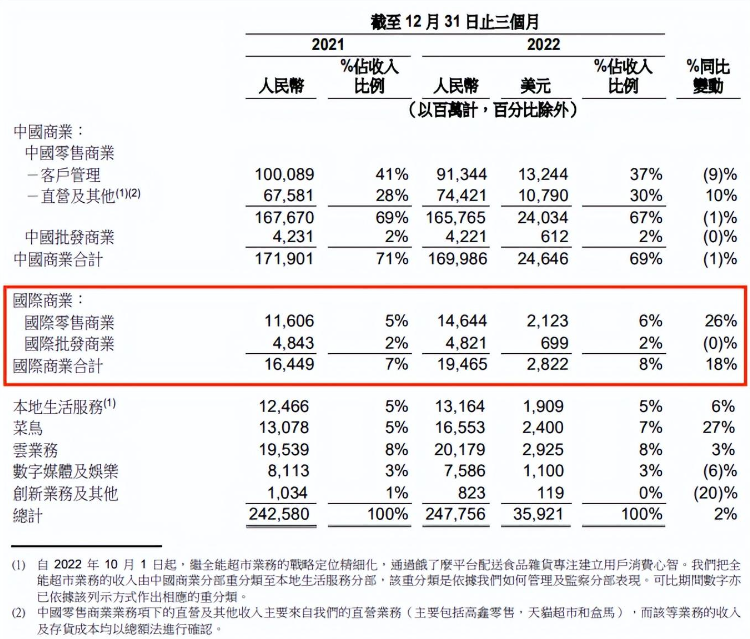 唯二還保持著高增速的業(yè)務(wù),來(lái)自于菜鳥和海外電商,其中菜鳥增長(zhǎng)了27%,國(guó)際商業(yè)則增長(zhǎng)了18%,即將突破單季度200億關(guān)口。