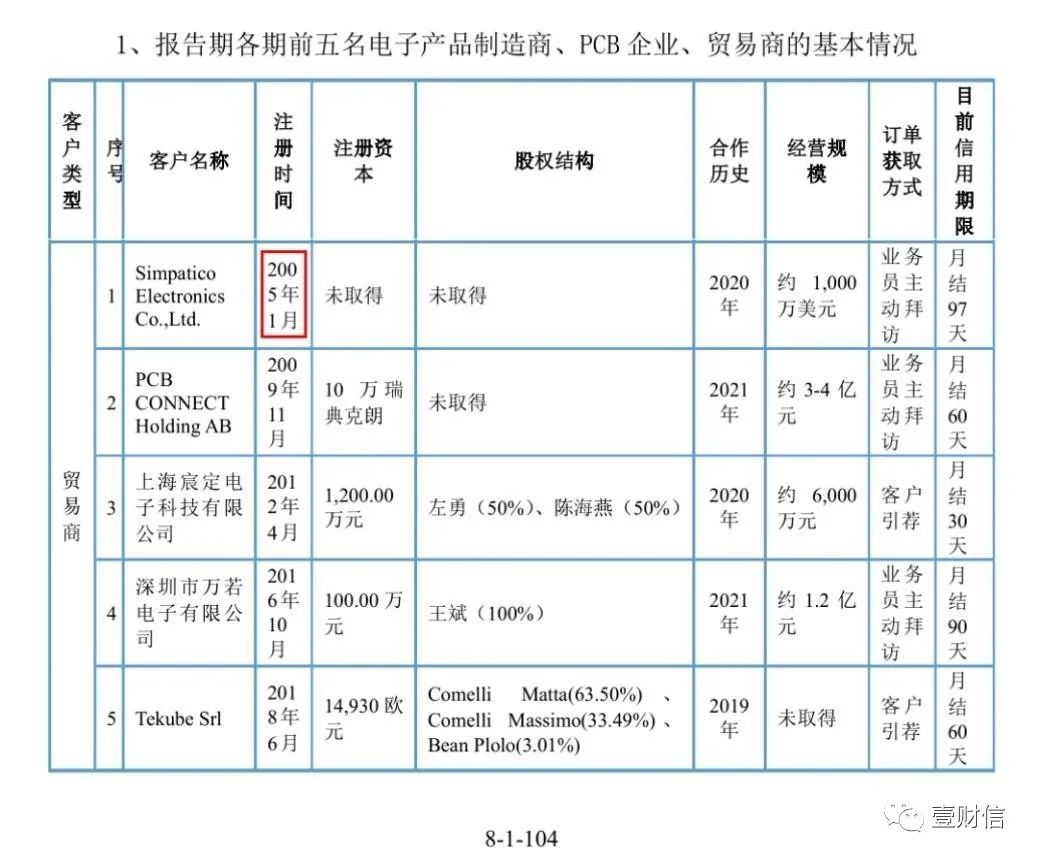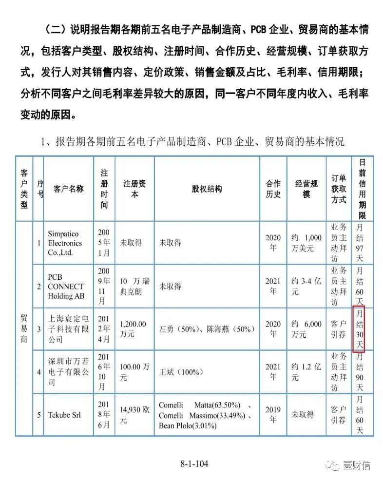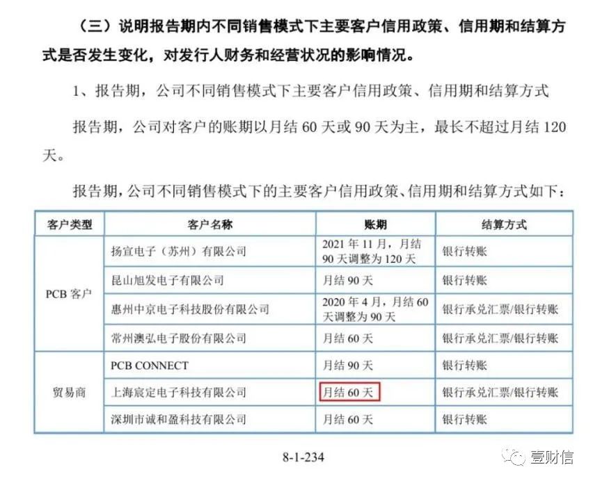 在介紹報告期各期主要貿(mào)易商基本情況時,一輪問詢回復(fù)顯示公司對上海宸定電子科技有限公司(下稱:上海宸定)目前信用期限為月結(jié)30天;在說明報告期內(nèi)不同銷售模式下主要客戶信用政策、信用期時,則顯示對上海宸定的賬期為月結(jié)60天,此處同表格其他客戶存在賬期更改的情況及說明,但對于上海宸定的賬期前后敘述不一的情況并未有說明,是否同樣存在賬期調(diào)整的情形不得而知。