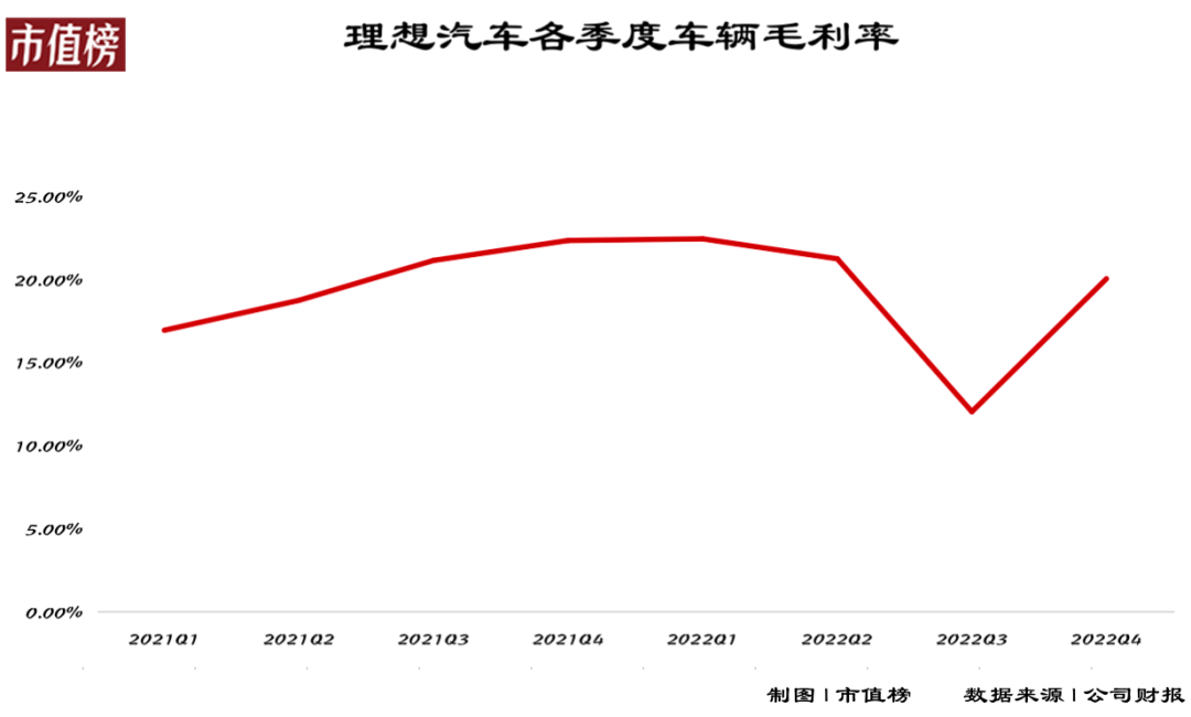 唯獨有最重要的一條,是理想面臨的一個難題。2022年,理想的凈虧損來到了人民幣20.3億元, 較2021年的3.215億元擴大了534.21%。理想的毛利率也下降了1.9個百分點至19.4%。