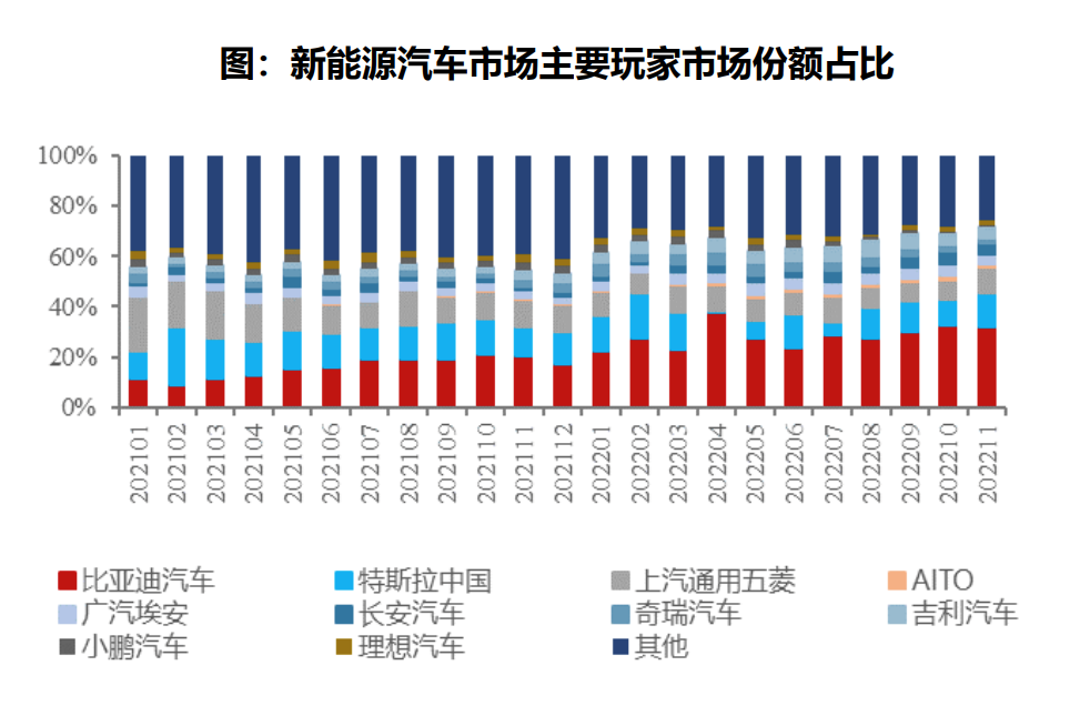 第二,過去的競爭已經(jīng)塑造出了階段性的市場格局,即“兩超多強”,兩超是特斯拉和比亞迪。